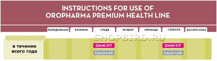 2 раза в неделю, а не 4 как написанно в инструкции. Его рекомендуют давать совместно с Омни-Вит - (мультивитаминный препарат для птиц на основе витаминов и аминокислот), который в инструкции написанно давать один раз в неделю.