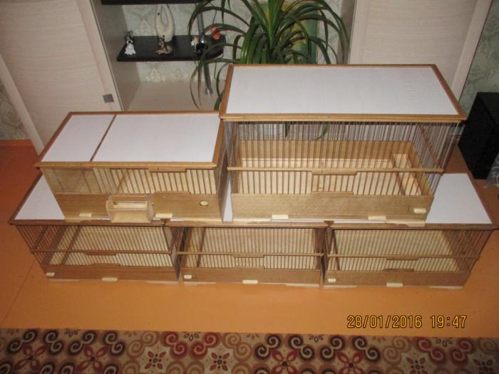 Добрый вечер!Вот предыдущие клетки полностью готовые !Натянут верх и покрыты лаком.Ещё правда добавил две клетки к общему количеству ,это клетка для жаворонка с баней для песка, и клетка для дрозда.