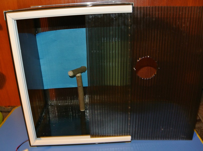Над, муж у Вас с руками. Вижу, что поликарбонат тёмный, а верхняя сторона, на которой лампы, тоже из тёмного сделана или из светлого? Лампы просто кладутся наверх или встроены в верхнюю часть бокса? Увидел, что ламп 5 шт., какая мощность у них? И ещё обратил внимание на интересный рисунок (отражение) в глазу птицы. Глядел-разглядывал, да так и не понял, что это.