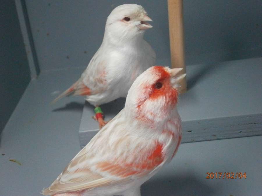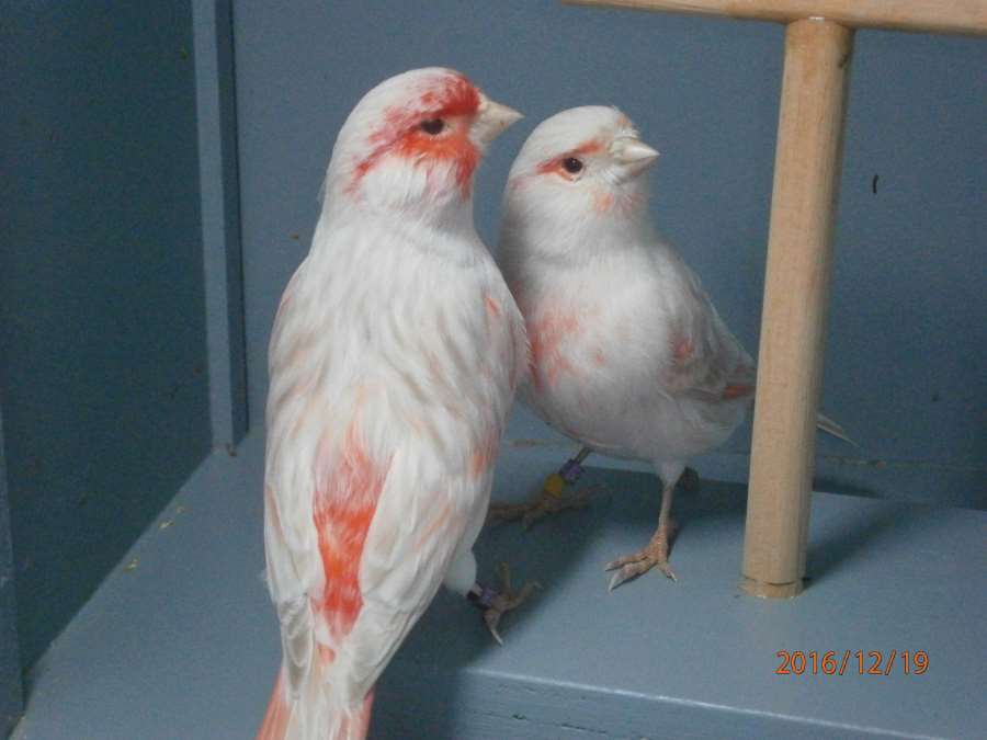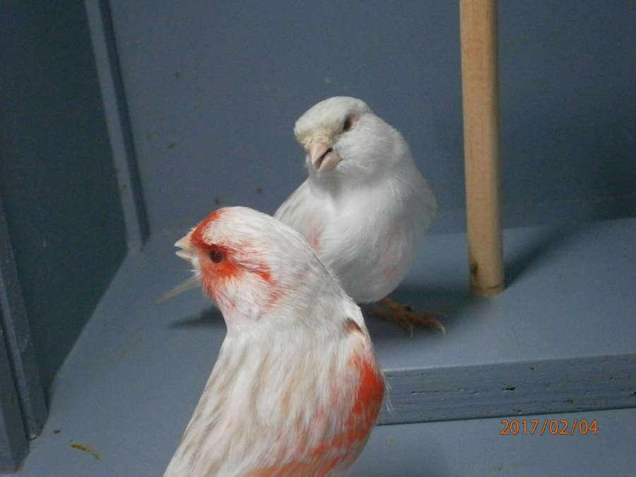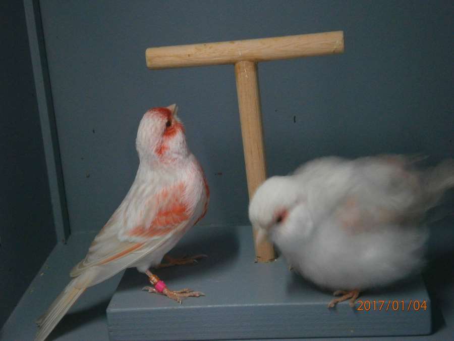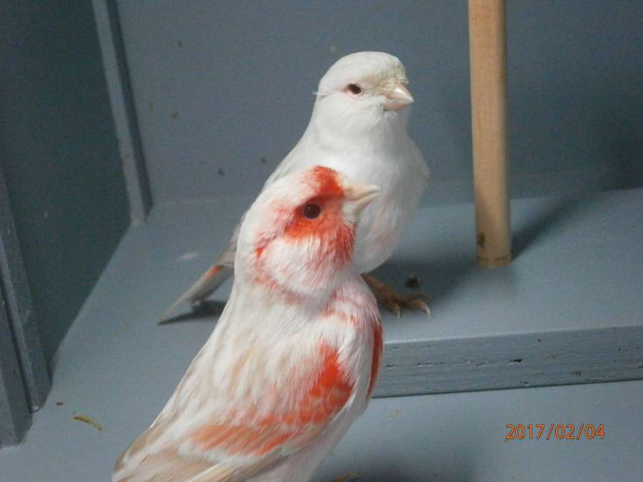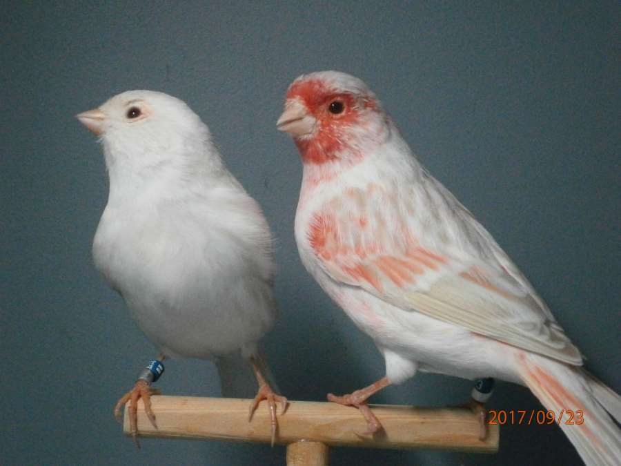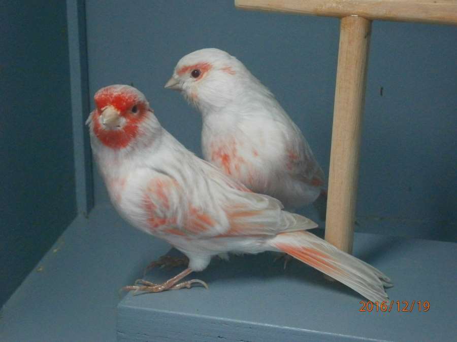 Канарейки: самец - изабелла красный мозаик тип2, самочка - сатинет красный мозаик тип1, птицы 2017 года.