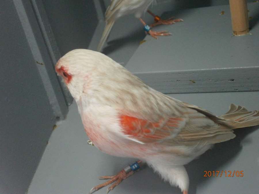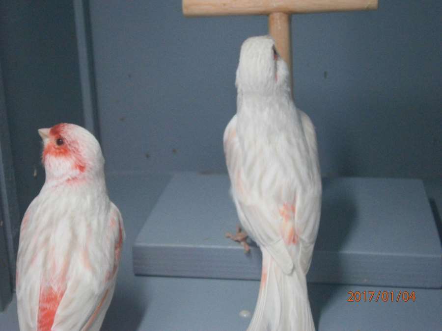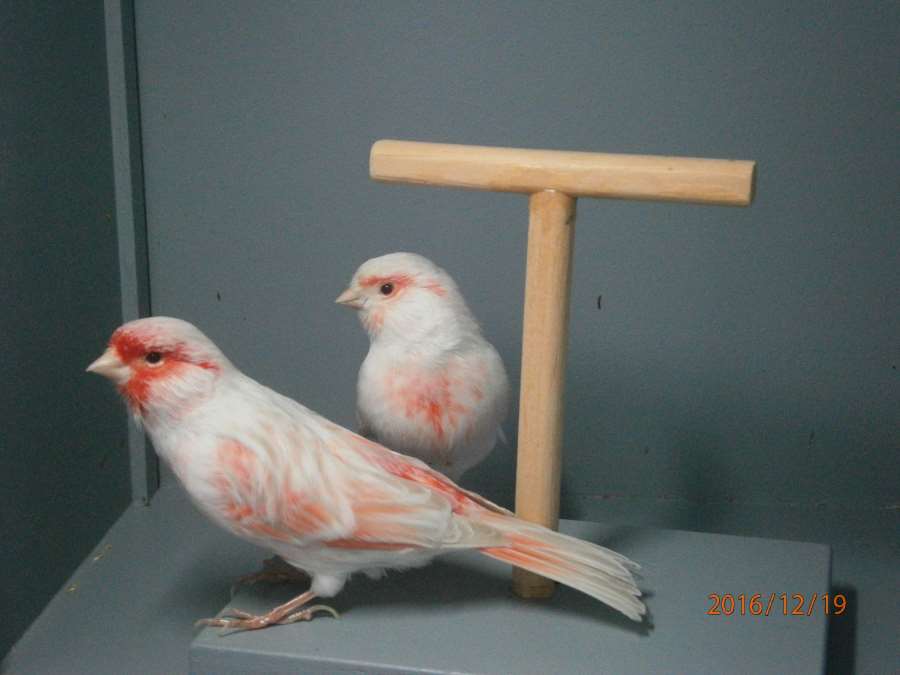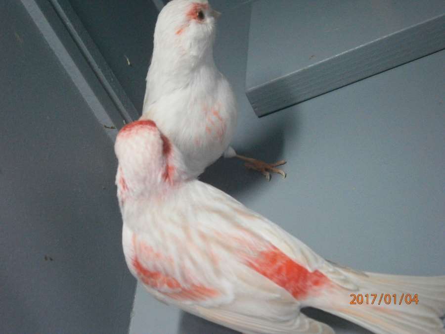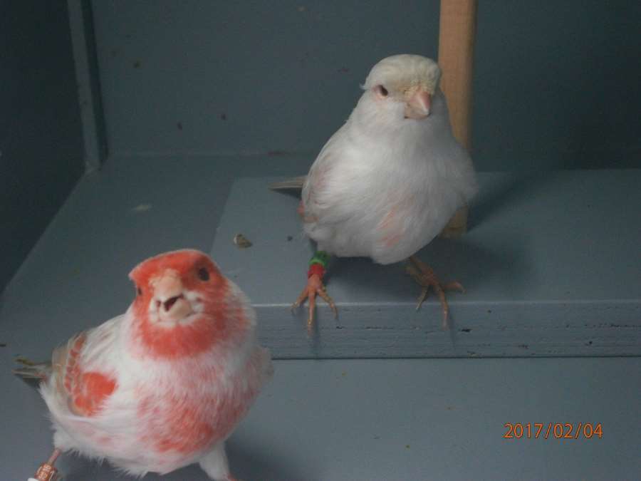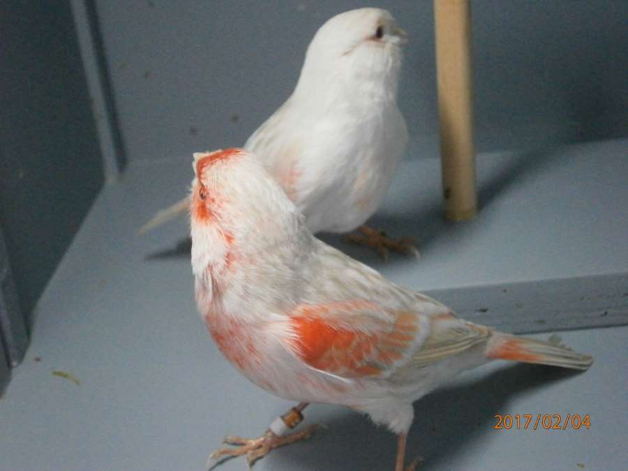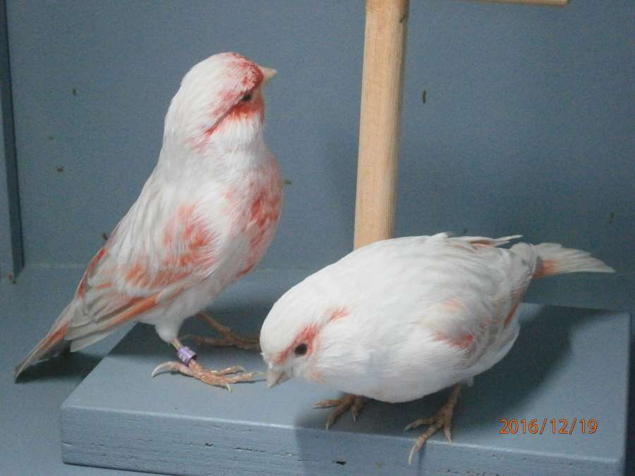 Канарейки: самец - изабелла красный мозаик тип2, самочка - сатинет красный мозаик тип1, птицы 2017 года.