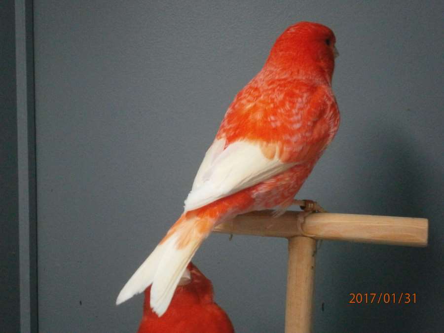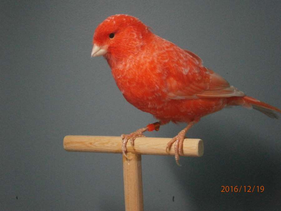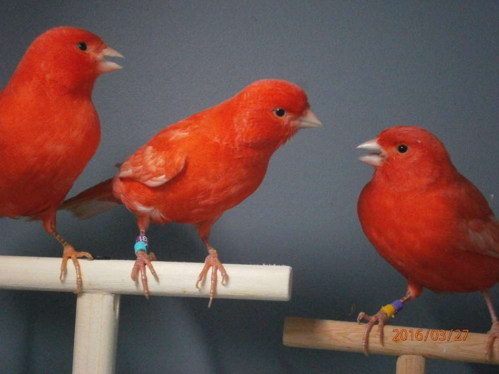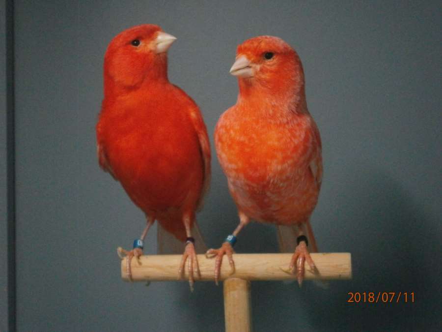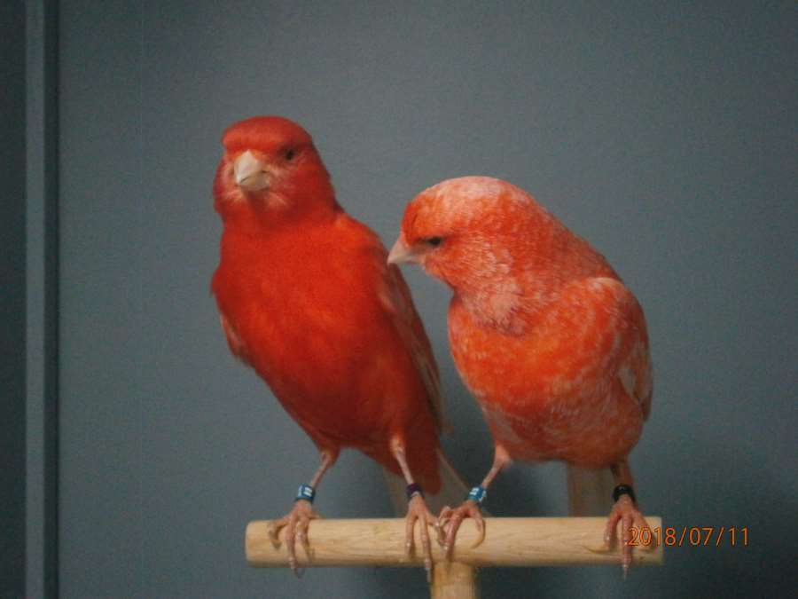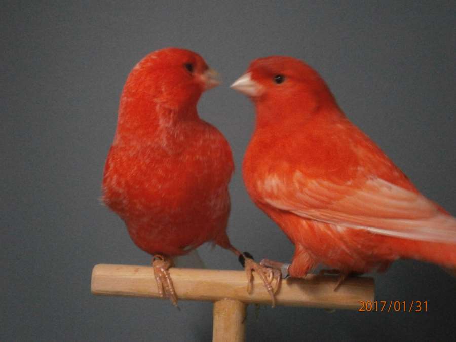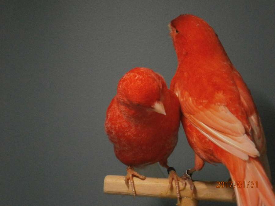 Красные канарейки, самец шиммель белокрылый - самочка интенсив, птицы собственного разведения, 2016 год.
