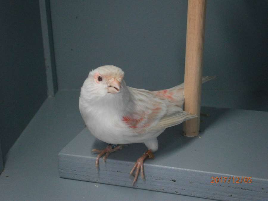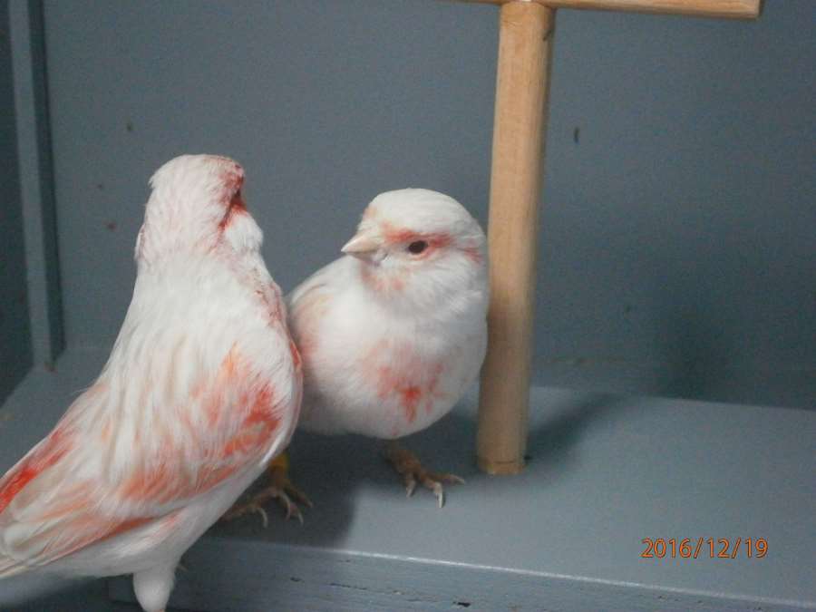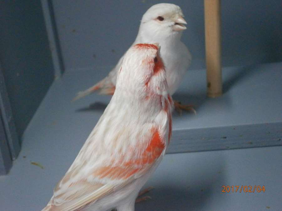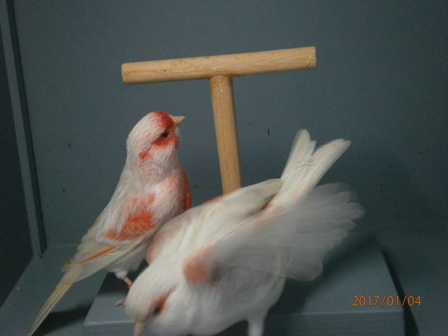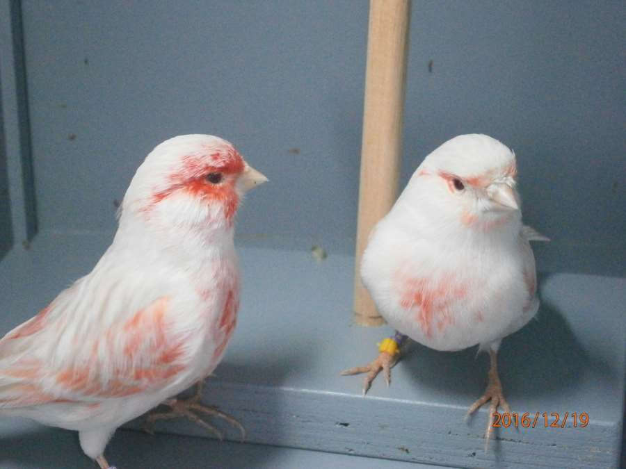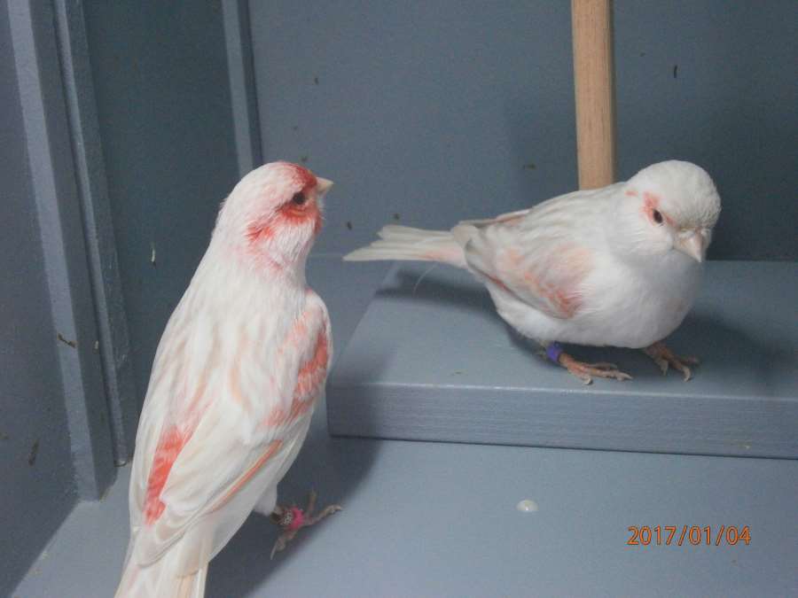 Канарейки: самец - изабелла красный мозаик тип2, самочка - сатинет красный мозаик тип1, птицы 2017 года.