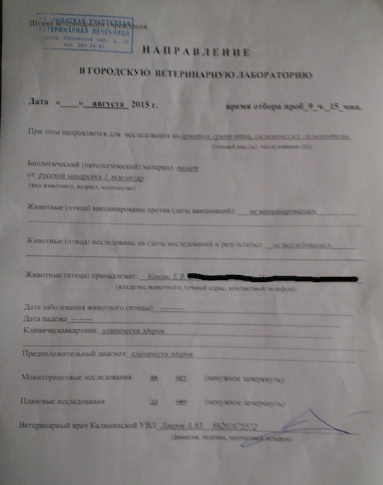 Первое, с чего нужно начинать, это найти Станцию по борьбе с болезнями животных (СББЖ) своего района! В моём случае это была СББЖ ЮВАО г.Москвы (ул. Старообрядческая дом 30Б). Туда нужно было приехать и написать заявление на имя главврача с просьбой о том, чтобы ко мне на дом приехал вет.врач с целью осмотра животного/птицы и постановки его на карантин. Карантин длится по закону 30 дней.