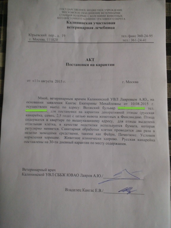 Итак, рассказываю, как без проблем перевезти птицу за границу, а именно в страну Евросоюза. Правила довольно строгие, для каждой страны они свои. У меня конкретный пример перевоза канарейки в Финляндию. Сразу хочу сказать: перед тем, как начинать это дело (оформление всех документов) -- подумайте 125 раз!! Стоит ли игра свеч? Потому что побегать по разным местам вам придётся немало