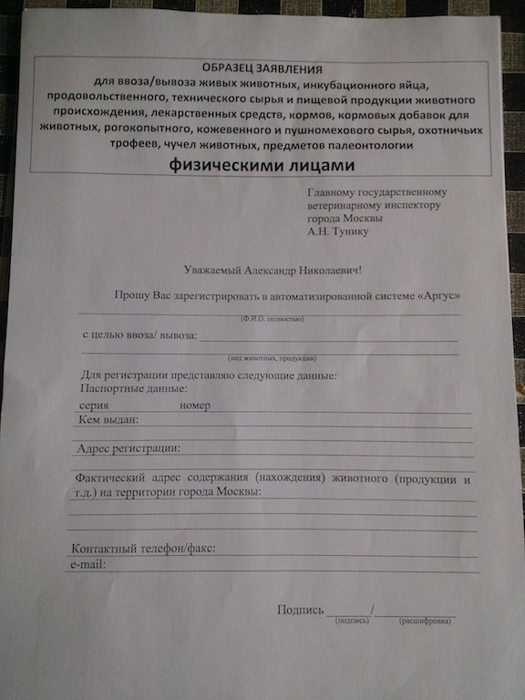 Добавлено спустя 4 минуты 32 секунды:Далее нужно было съездить в Комитет Ветеренарии г.Москвы с выданным врачом Актом постановки на карантин. Комитет находится на ул.Донская, д.37, к.3 (м.Шаболовская). Там в "службе одного окна" нужно написать заявление о том, что я прошу зарегистрировать меня в системе "Аргус", т.е.чтобы они прислали мне логин и пароль к этой системе. Заявление такое: