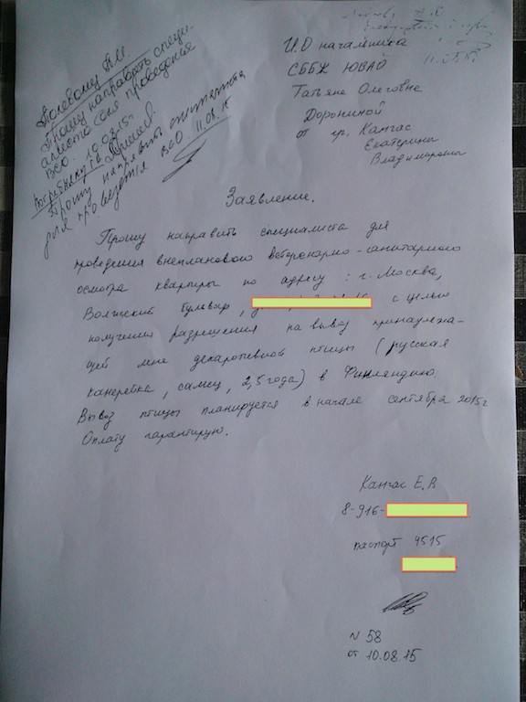 Первое, с чего нужно начинать, это найти Станцию по борьбе с болезнями животных (СББЖ) своего района! В моём случае это была СББЖ ЮВАО г.Москвы (ул. Старообрядческая дом 30Б). Туда нужно было приехать и написать заявление на имя главврача с просьбой о том, чтобы ко мне на дом приехал вет.врач с целью осмотра животного/птицы и постановки его на карантин. Карантин длится по закону 30 дней.