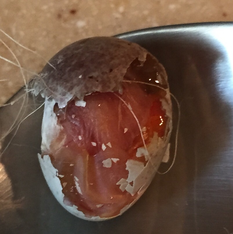 Забрала еще одно яйцо из гнезда, которое со вмятиной было. Решила тоже вскрыть посмотреть. Я так думаю и третье яйцо придется изъять сегодня, тк самка настороженно относится к нему, наверное тоже попытается склевать.