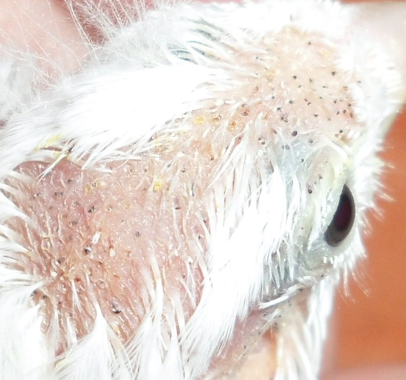 Подскажите пожалуйста,что с моим птенцом??На голове нет перьев,вместо них черные точки,возраст на фото 16-17 дней.Предположение что это очинный клещ??Но родители чистенькие,другие птенцы из гнезда тоже в порядке.Просмотрела под микроскопом перья ,очины,никого не нашла...Подскажите пожалуйста,что это может быть??