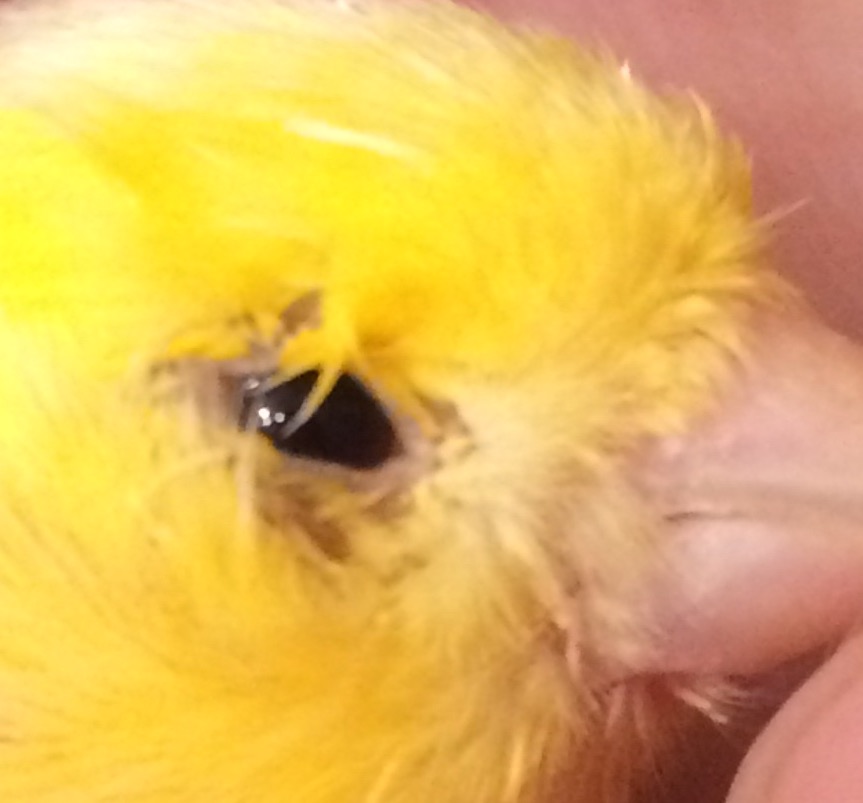 У канарейки что-то с глазом. Утром обратили внимание, что один глаз открыт и все нормально, а второй не открывается, слиплись пёрышки вокруг. При этом канарейка нормально ориентируется в клетке, перескакивает с жердочки, кушает. Через минут 10 глаз разлепился, мы дополнительно промыли слабым раствором ромашки. Но глаз выглядит немного припухшим, канарейка продалжает его щурить и закрывать. На фото глаз после промывания. Второй глаз нормальный. Что это может быть?