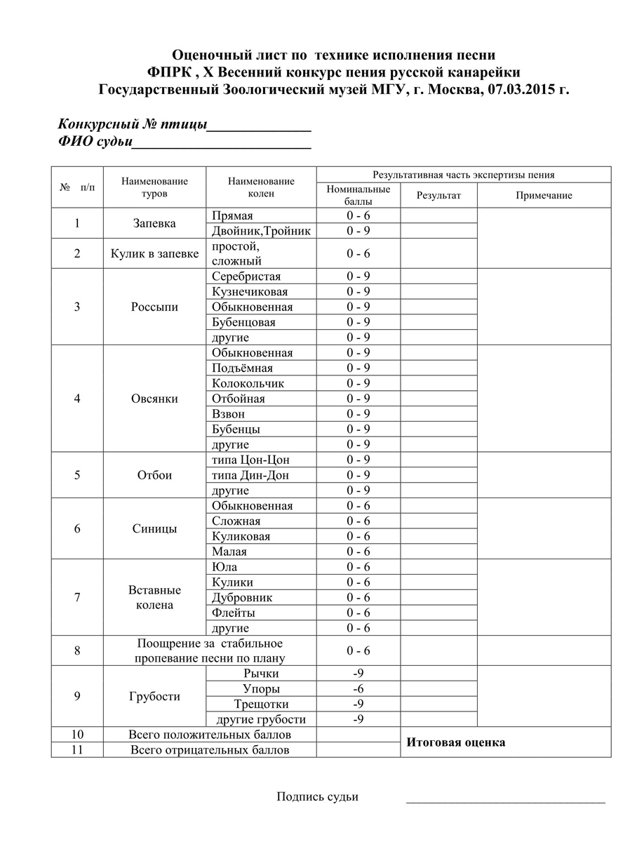 Глядя на него многие поймут, где основные колена, а где вспомогательные. Сразу замечу, что он не сильно отличается от того оценочного листа, который был принят на собрании Московского клуба любителей канареек, проходившем в апреле 2014 года. Но для пытливых и желающих понять что к чему там есть небольшие, но интересные изменения. Но это можно будет разобрать потом, если будет кому-то интересно.