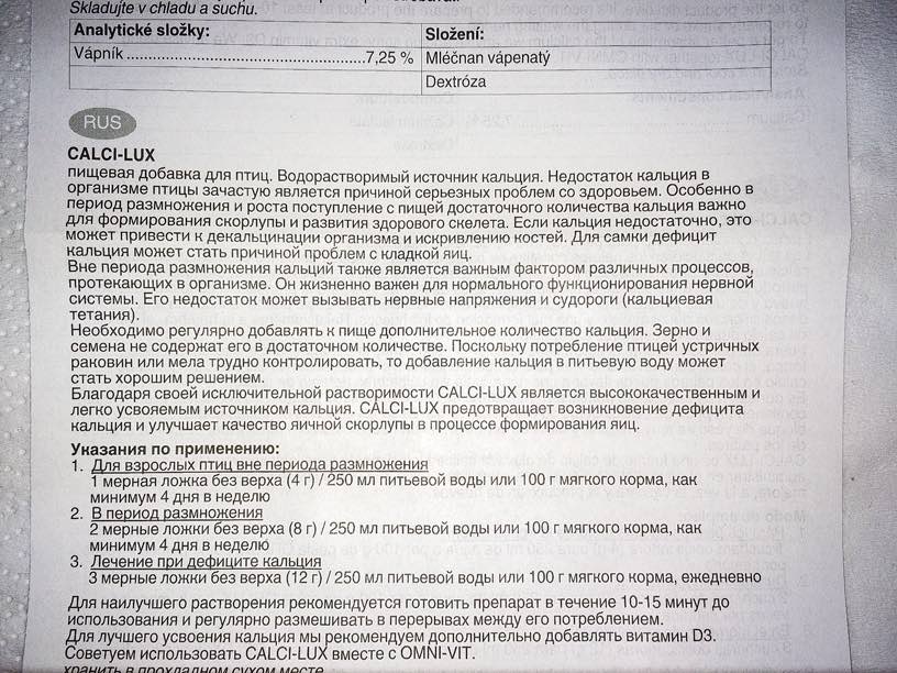 2 раза в неделю, а не 4 как написанно в инструкции. Его рекомендуют давать совместно с Омни-Вит - (мультивитаминный препарат для птиц на основе витаминов и аминокислот), который в инструкции написанно давать один раз в неделю.