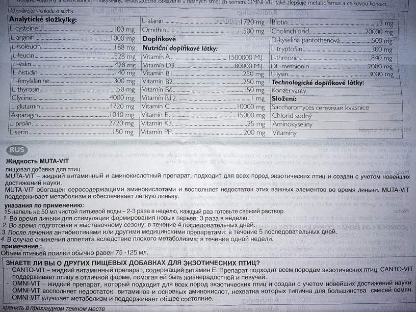 Так же мы принимаем витамины для птиц в период линьки Muta-Vit - (это мультивитаминный препарат для птиц на основе витаминов и аминокислот, с высоким содержанием серных аминокислот и биотина).