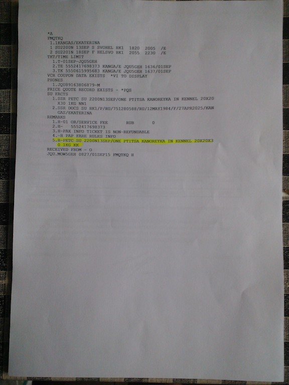Добавлено спустя 3 минуты 46 секунд:Теперь ещё одна важная деталь. Многие бронируют билеты на самолёт заблаговременно. Поэтому при бронировании билета обязательно нужно согласовать с авиакомпанией, что вы везёте животное. Между Россией и Финляндией провоз животных в салоне разрешён только у Аэрофлота. Дозвониться до них я не смогла, поэтому пришлось съездить в офис Аэрофлота, купить там билет и одновременно согласовать. Я там сидела примерно полчаса, в итоге мне всё согласовали и выдали бронь, где было указано, что везу в ручной клади птицу. Как мне объяснила работник кассы, это делается для того, чтобы потом вдруг не оказалось, что на соседнем сидении кто-то летит с кошкой