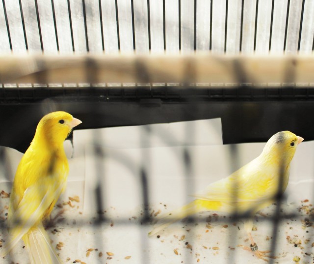 К сожалению, жёлтый интенсивный кенарь у средней самки погиб зимой. И теперь у меня собственно три пары: старшие надёжные жёлтые шиммели (выше), а также ещё две парочки.