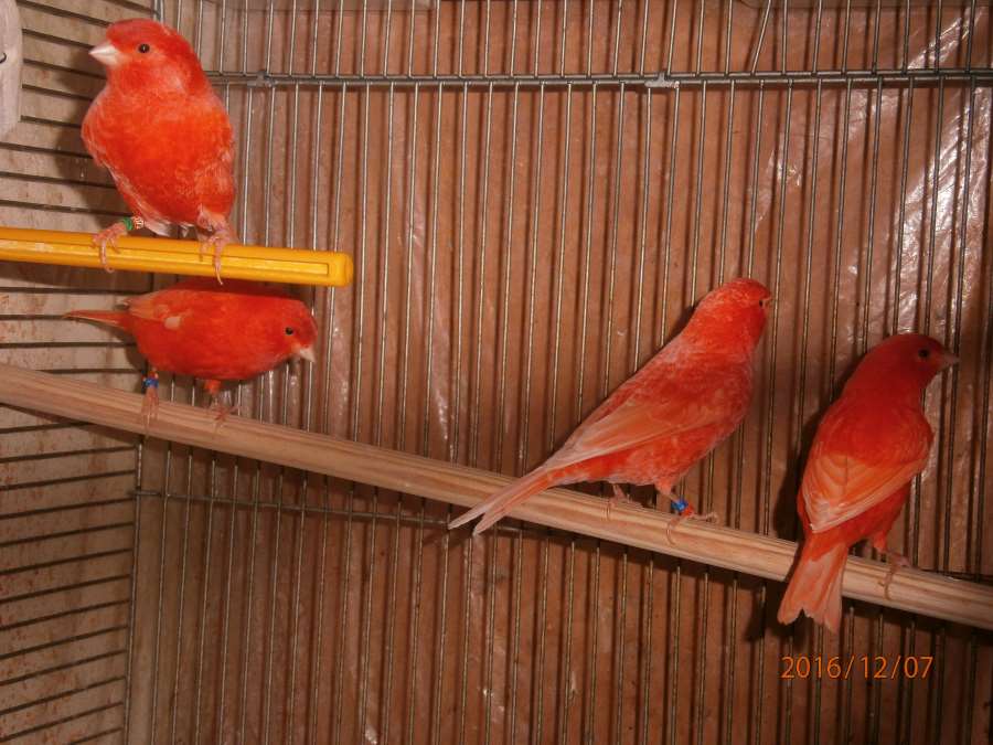 Красные канарейки, самец шиммель белокрылый - самочка интенсив, птицы собственного разведения, 2016 год.