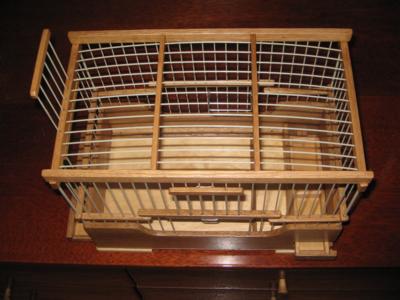Здравствуйте, форумчане. Выставляю на показ очередную свою работу. Размеры клетки: дл.-80см., шир.-35см., выс.-50см. Решетка фирмы "Граф". Она, как и перегородка, съемная. Клетку оборудовал: гнездами, съемными жердочками, поилками, дополнительными кормушками для
