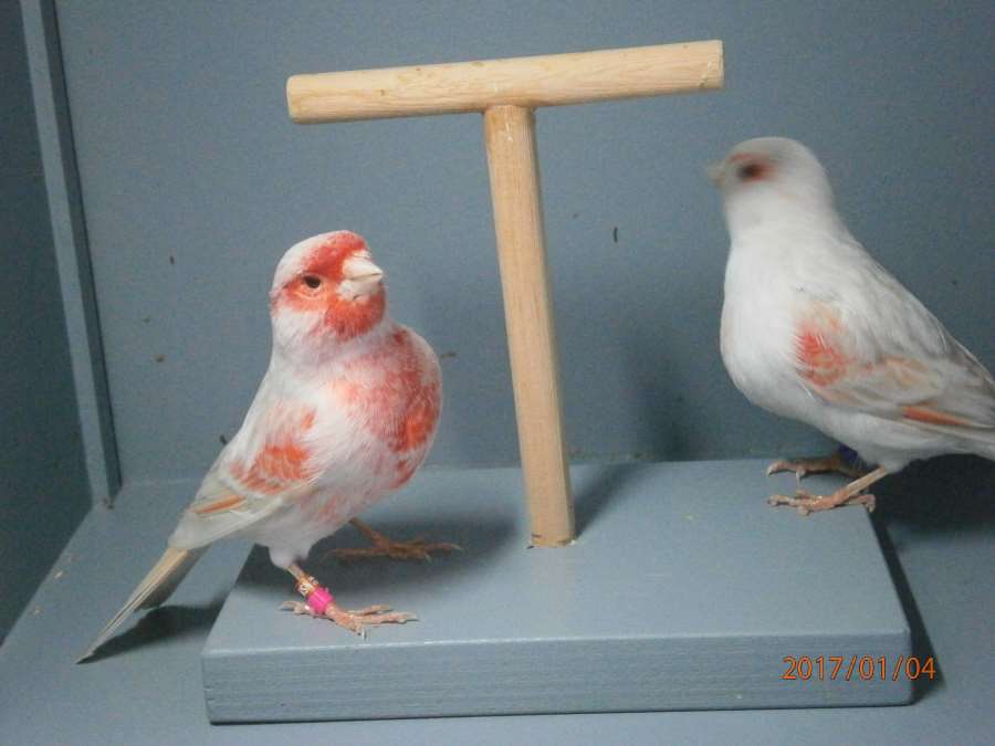 Канарейки: самец - изабелла красный мозаик тип2, самочка - сатинет красный мозаик тип1, птицы 2017 года.