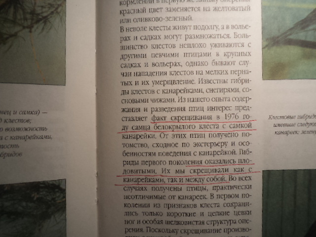 Не большая цитата: " Из нашего опыта содержания и разведения птиц интерес представляет факт скрещивания в 1976 году самца белокрылого клеста с самкой канарейки. От этих птиц получено потомство, сходное по экстерьеру и особенностям поведения с канарейкой. Гибриды первого поколения оказались плодовитыми. Их мы скрещивали как с канарейками, так и между собой. Во всех случаях получены птицы, практически неотличимые от канареек".