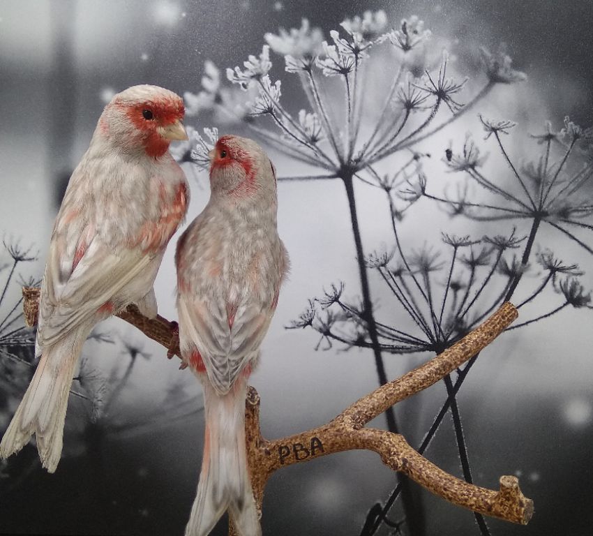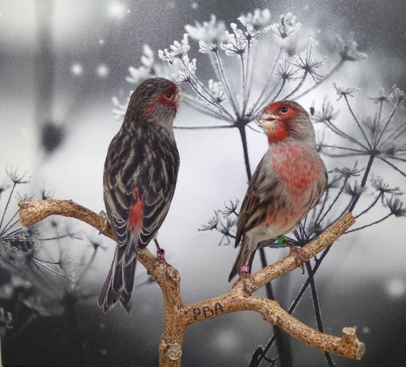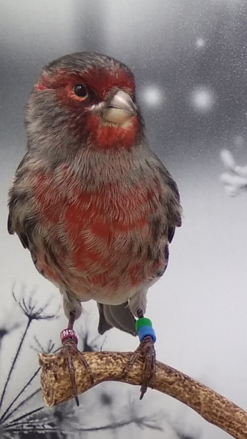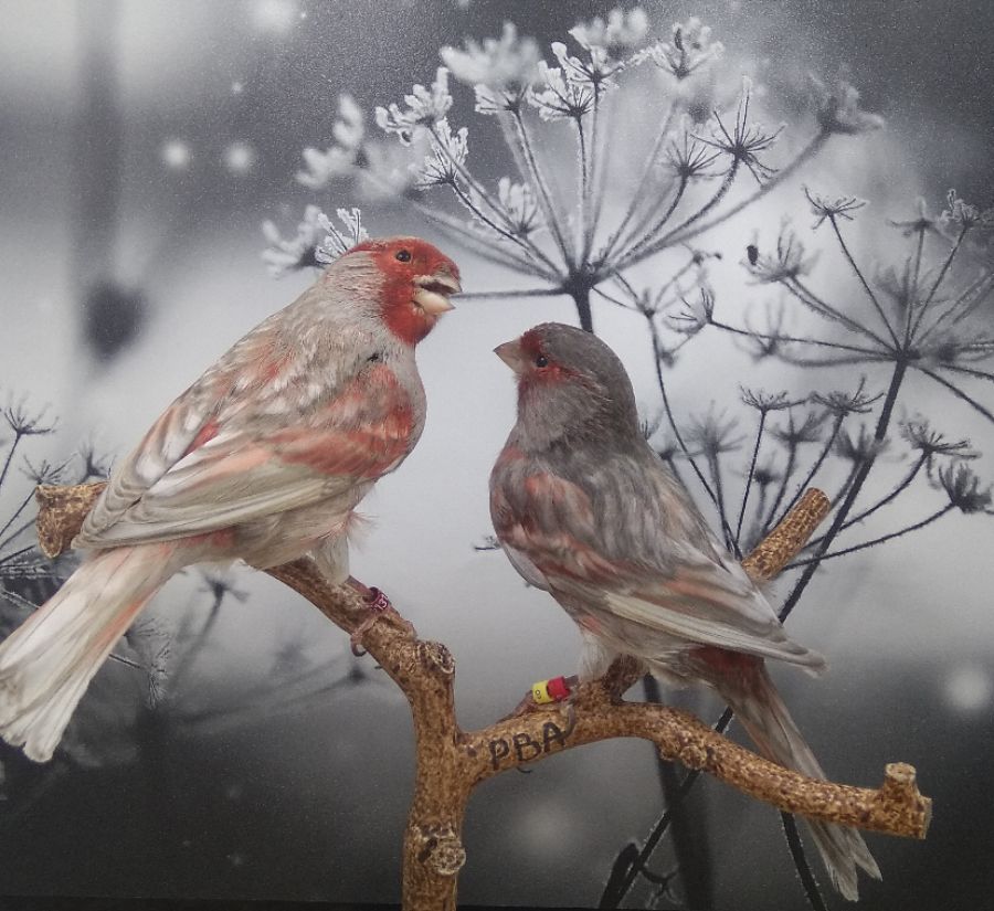 Это канарейки чёрно красный мозаик, а название видео образное просто такие ассоциации у меня возникли, фон на зимнюю тематику и птицы красногрудые.