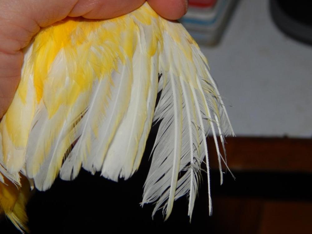 Подскажите, пожалуйста, в чем может быть проблема? Кенар, возраст чуть меньше года. В августе - сентябре перелинял. Но после этого выпали перья на хвосте, а сейчас остались какие-то обломанные куски, и теперь еще обнаружили обломанные перья на крыльях. Кормим смесью РИО для канареек, в клетке висит минеральный камень, мел. Несколько раз в неделю даем яблочко, морковку. Что случилось с оперением птица? Может быть ему не хватает витаминов? Хотя птиц активный, поет, целуется с самочкой (у самочки с перьями и хвостом все в порядке).