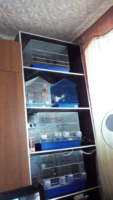 Птицы летом живут на балконе,а зимовать будут в клетках,на стеллаже)