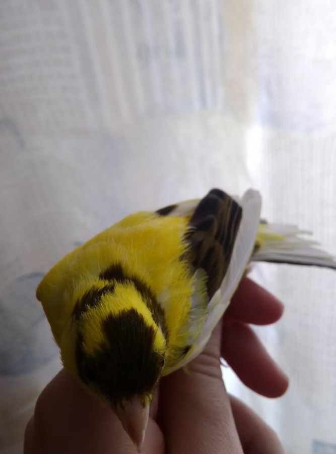 Вот так птенчик выглядит. К сожалению хорошего фотоаппарата нет сейчас, на телефон снимала. Не очень хорошо заметно, но у него не белое перо, а с желтоватым налетом, причем не только края маховых, но и контурное оперение.