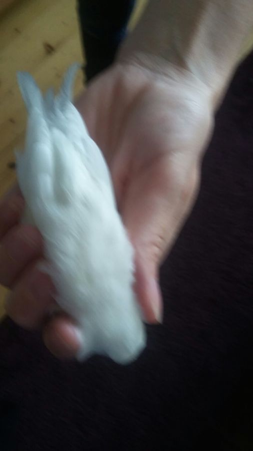 Lauri, как бы не английская рецессивная.... птица крупная, оперение пышное, желтизны на крыльях не видно. посмотрите вживую внимательно, есть желтизна на крыле или птица идеально белая? так же можете раздуть оперение и посмотреть цвет кожи! 2116