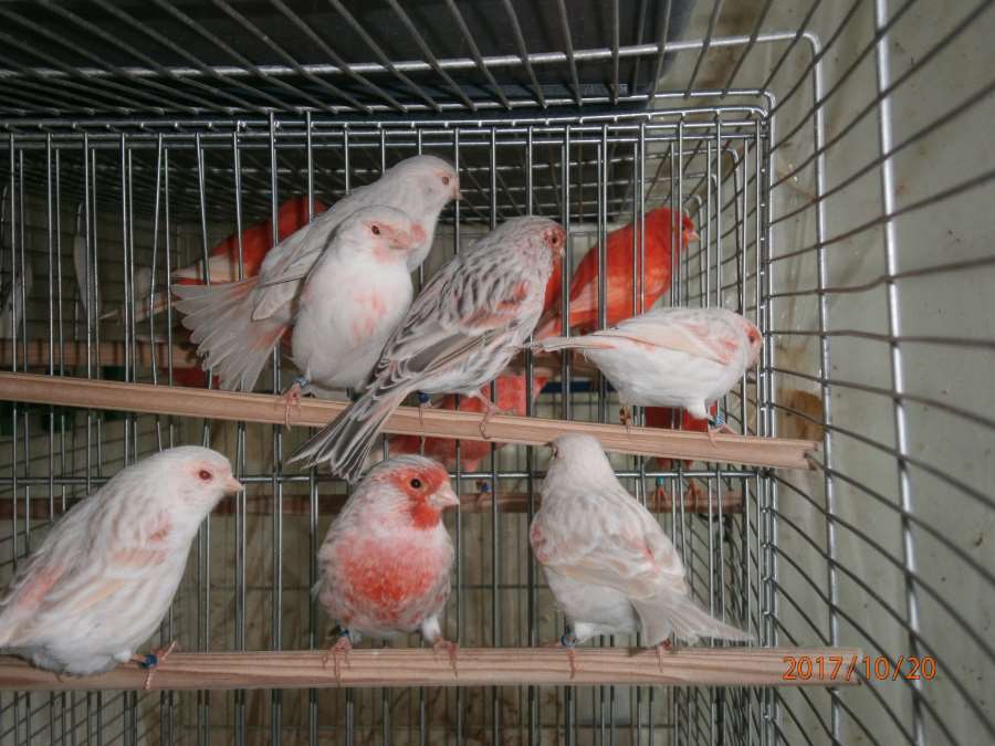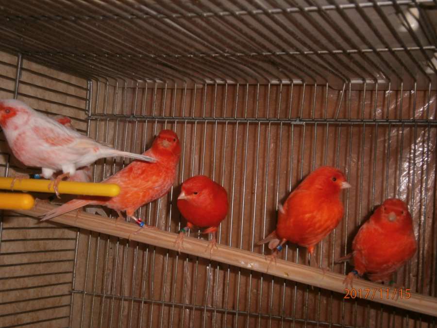 Молодые канарейки в общей клетке... Агат красный мозаик тип2(самцы) и Сатинет красный мозаик тип1(самочки).