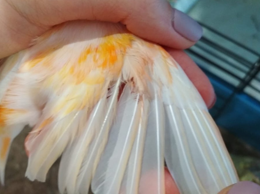 Здравствуйте! У моего кенара на крыльях было такое же, но он в этот момент линял и я связала это с линькой. Причем сначала на одном крыле, а потом на другом. Сейчас он отлинял и все прошло.