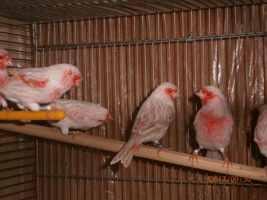 Молодые канарейки в общей клетке... Агат красный мозаик тип2(самцы) и Сатинет красный мозаик тип1(самочки).